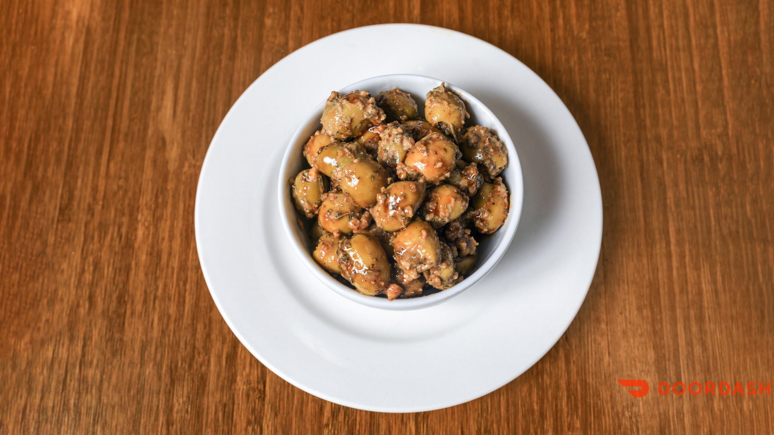 Marinated green olives with walnuts,pomegranate paste & mountain herbs.